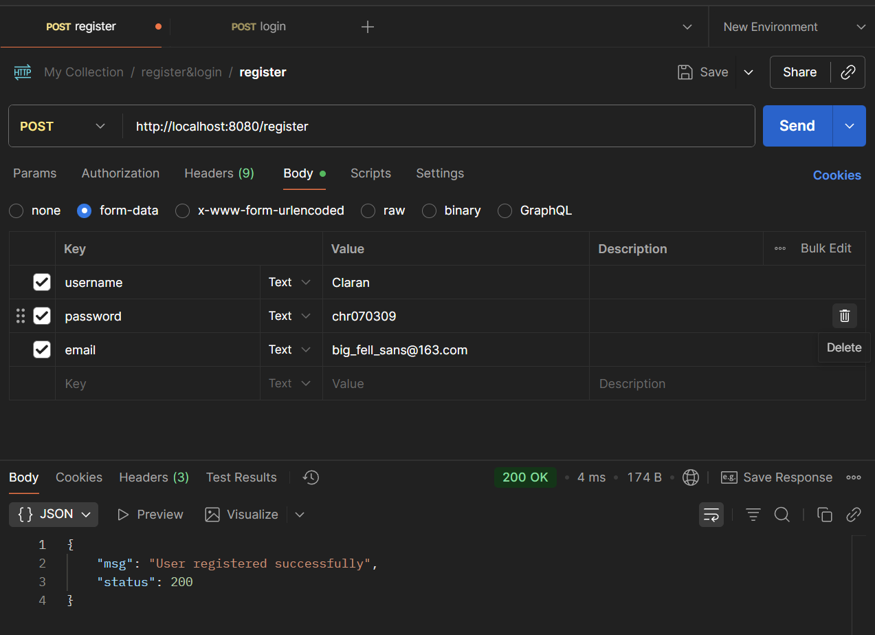 该操作向 http://localhost:8080/regitser 发送了表单数据:username=Claran&password=chr070309&email=big_fell_sans@163.com数据
