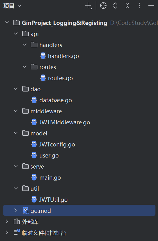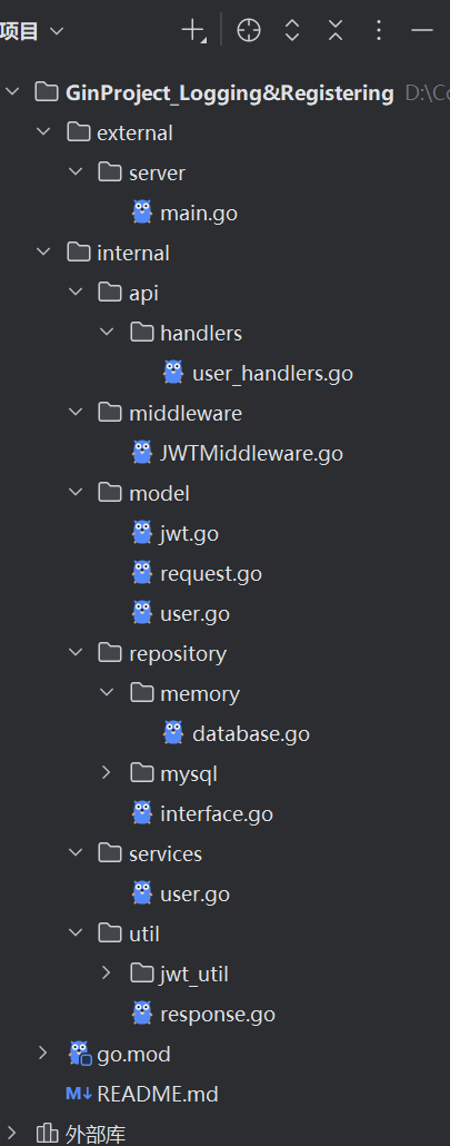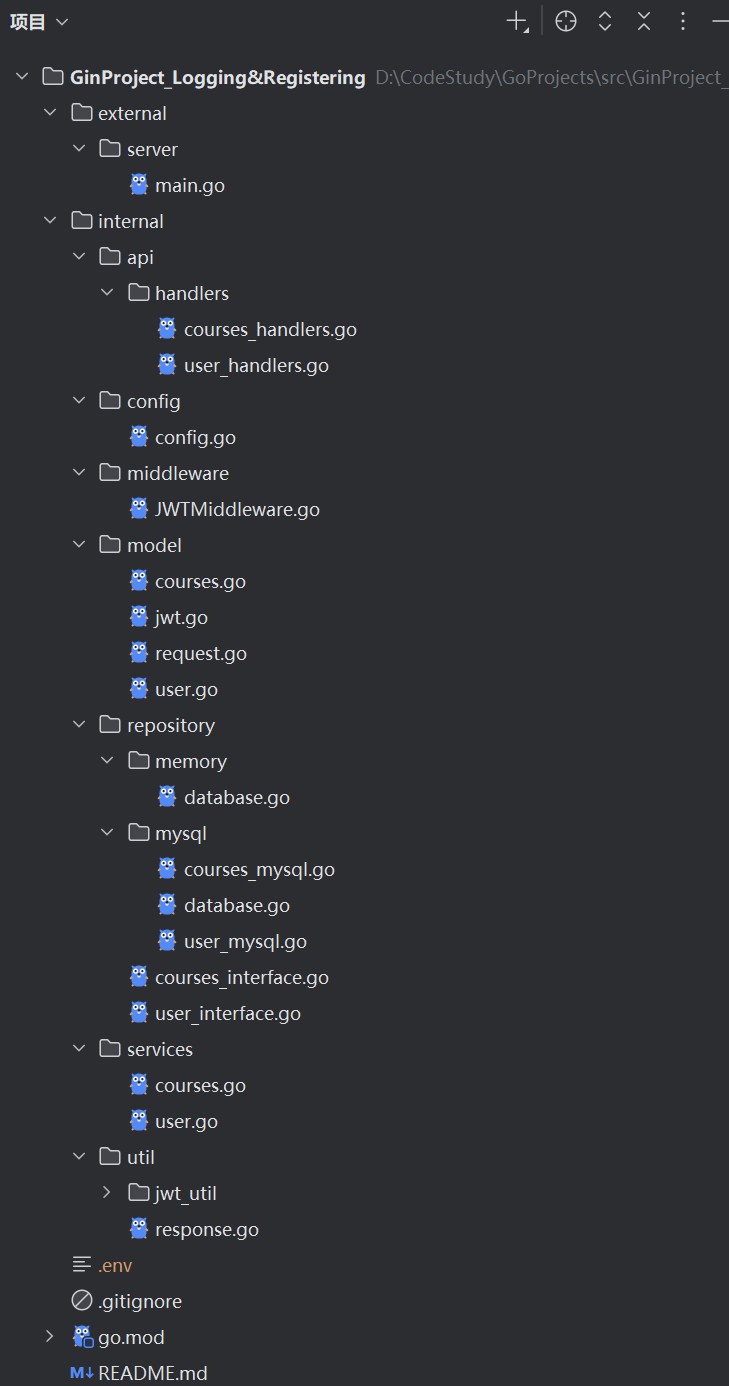 | GinProject_Logging&Registering/ ├── api/ │ ├── dao/ │ │ ├── cache/ │ │ │ ├── interface.go │ │ │ └── redis.go │ │ ├── memory/ │ │ │ └── database.go │ │ └── mysql/ │ │ ├── courses_mysql.go │ │ ├── database.go │ │ ├── todo_mysql.go │ │ └── user_mysql.go │ ├── handlers/ │ │ ├── courses_handlers.go │ │ ├── todo_handlers.go │ │ └── user_handlers.go │ └── services/ │ ├── courses.go │ ├── todo.go │ └── user.go ├── cmd/ │ └── main.go ├── internal/ │ ├── config/ │ │ └── config.go │ ├── middleware/ │ │ └── JWTMiddleware.go │ ├── model/ │ │ ├── courses.go │ │ ├── jwt.go │ │ ├── request.go │ │ ├── todo.go │ │ └── user.go │ └── util/ │ └── jwt_util/ │ ├── interface.go │ ├── util.go │ ├── password.go │ └── response.go ├── .env ├── .gitignore ├── go.mod ├── go.sum └── README.md